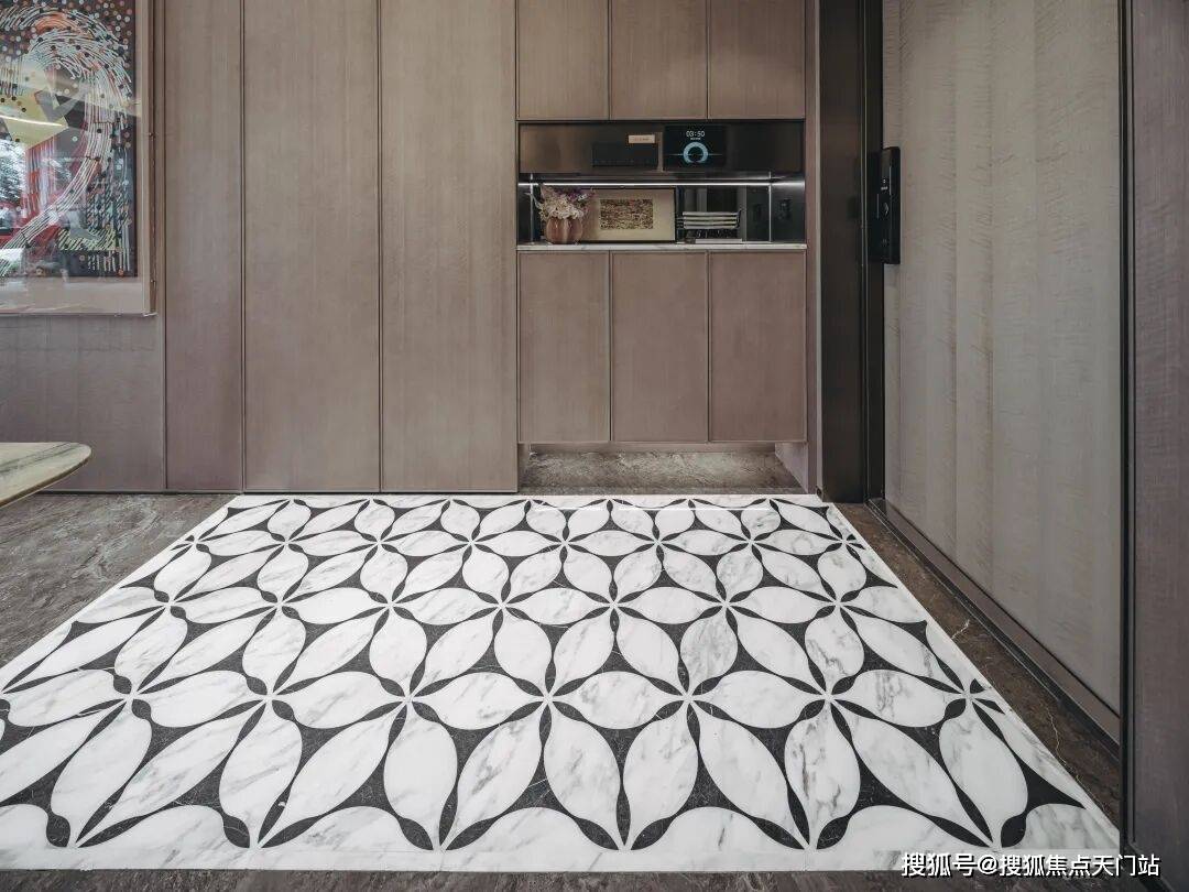 比如入户门选用了定制化的仿铜铸铝门,嵌入普拉达绿奢石中古铜色门牌号,高级酒店般的质感营造的非常细腻。