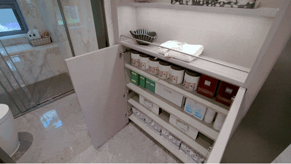 在主卫中,它的功能划分成为三个区域。1区适合改造成抽拉式的梳妆台,侧面放满各种各样的护肤品。2区在淋浴区转角的地方,放置浴盆。3区放置了一个浴凳,坐着洗澡,壁龛里的淋浴用品,触手可及!