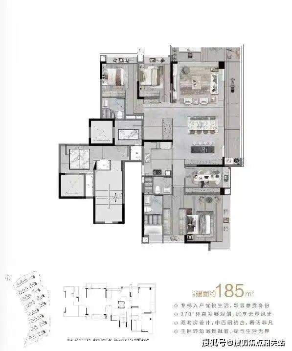 该户型是项目的楼王藏品户型,建面约185-285㎡,规划为四房两厅三卫,采用双梯一户专属设计,仅少量限量发售,是项目的顶级户型,适配广佛高净值改善客群,能够满足终极改善的居住需求,享受极致的湖居尊崇体验。