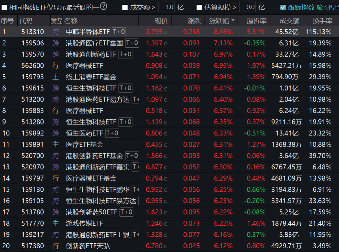 此外,得益于外围等市场上涨跨境ETF同样出现不俗表现,185只跨境ETF上涨,占比同样超过90%。从细分赛道来看,资金追逐的同样是半导体、医药等主题ETF。其中,华泰柏瑞基金旗下的中韩半导体ETF全天上涨8.46%,是当天全市场涨幅最高的ETF。跟踪港股医药类指数的港股通医疗ETF富国、港股通创新药ETF、恒生生物科技ETF、港股通医药ETF易方达等10多只ETF,涨幅均超过6%。