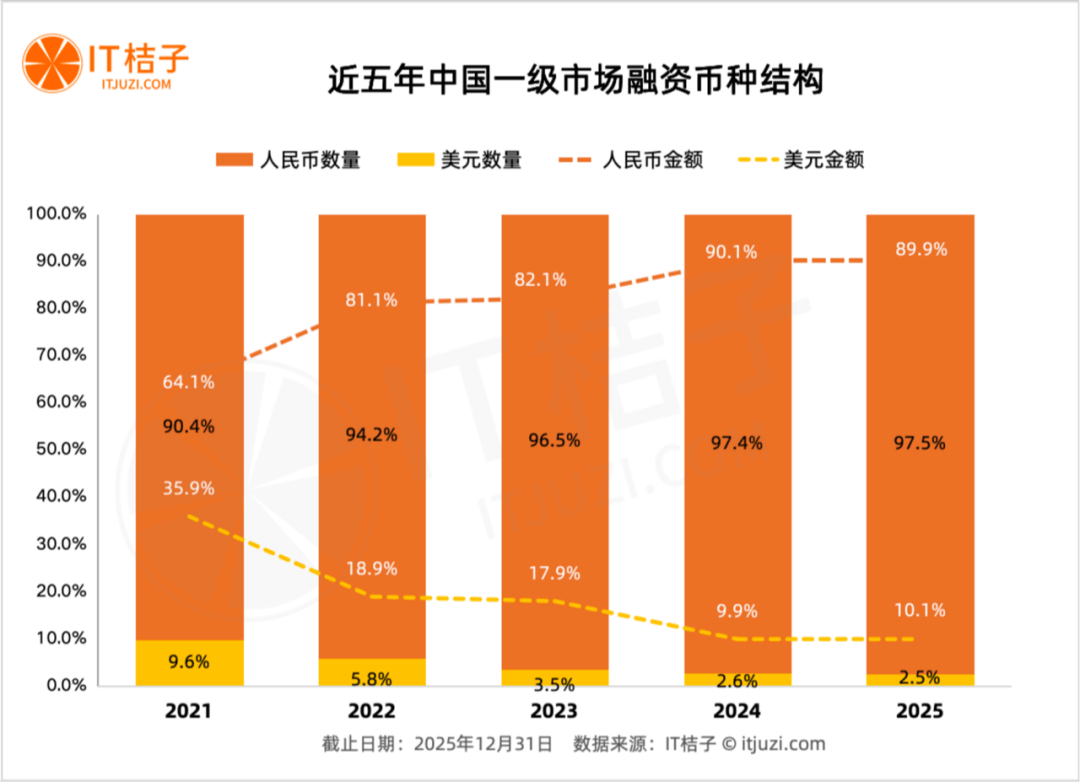 2021年,美元投资事件尚有871起,占市场总数的9.6%;到了2025年,这一数字锐减至225起,占比萎缩至仅2.5%。