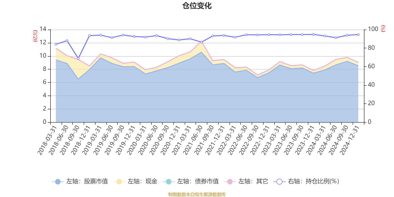 据定期报告数据统计,近三年平均股票仓位为93.82%,同类平均为85.68%。2023年末基金达到94.73%的最高仓位,2018年三季度末最低,为68.85%。
