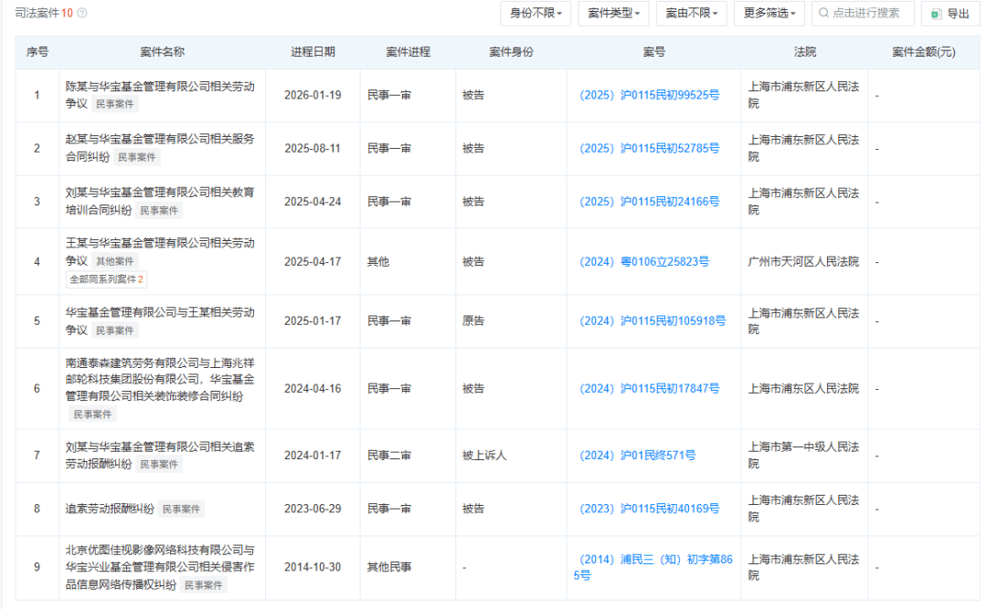 值得注意的是,这并非华宝基金近年首次出现劳动争议。此前,2026年1月19日,陈某也曾因劳动纠纷将华宝基金诉至法庭。短时间内频发的劳动纠纷,尤其是涉及职场霸凌与违规操作的指控,引发了市场对华宝基金内部治理结构和企业文化的担忧。