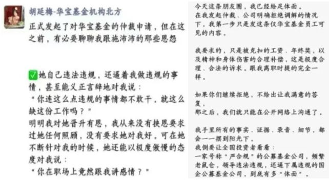 就在胡洁离任消息逐渐平息之际,一则朋友圈截图在基金行业内部悄然流传。2026年2月底,华宝基金前员工胡延梅在社交平台上发布长文,实名控诉其在华宝基金北京分公司工作期间,遭遇长期职场霸凌,并被要求进行违规操作。文中措辞激烈,提及“频繁老鼠仓、领导违法违规、逼下属违规”等,并称目前已正式发起对华宝基金仲裁申请。