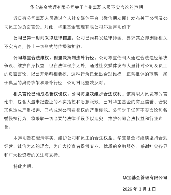 面对这封“控诉信”,华宝基金迅速反应。3月1日,正值周日,华宝基金发布官方声明,称个别离职人员发布大量未经查证的不实指控和恶意诋毁,严重损害公司商业信誉与合规形象,已构成名誉权侵犯;公司已第一时间采取法律措施,向其发送律师函,要求立即删除不实言论、停止传播。同时,华宝基金强调,尊重员工通过合法途径维权,但反对通过社交媒体进行舆论绑架、法外施压。