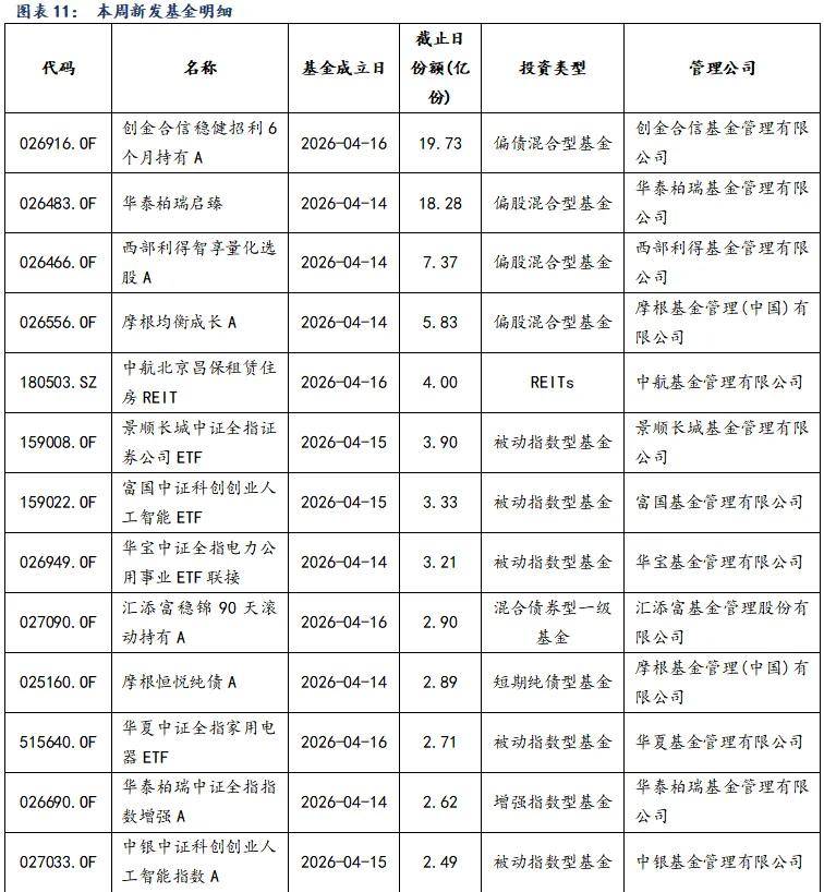 本周新成立基金发行明细一览:本周共成立基金25只,发行份额95.76亿份。其中,股票型基金13只,发行份额28.97亿份;混合型基金7只,发行份额52.52亿份;债券型基金2只,发行份额5.79亿份;REITs基金1只,发行份额4.00亿份;FOF基金2只,发行份额4.48亿份。本周新成立基金发行明细一览: