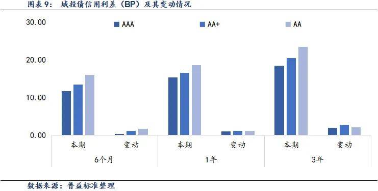 城投债信用利差[6]全部上涨。本周AAA级6个月期、1年期、3年期信用利差较上期分别变动0.34BP、1.09BP、2.00BP;AA+级6个月期、1年期、3年期信用利差较上期分别变动1.12BP、1.17BP、2.78BP;AA级6个月期、1年期、3年期信用利差较上期分别变动1.79BP、1.17BP、2.13BP。