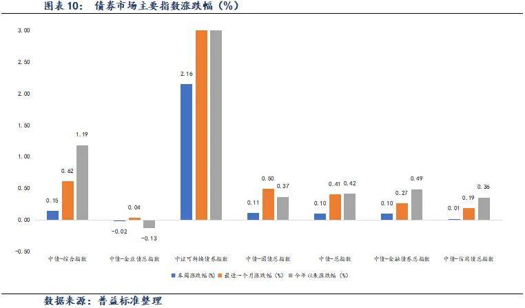 本周债市主要指数多数上涨。本周各主要指数具体表现如下:中债综合指数变动0.15%,中债企业债指数变动-0.02%,中证可转债总指数变动2.16%,中债国债总指数变动0.11%,中债总指数变动0.10%,中债金融债总指数变动0.10%,中债信用债指数变动0.01%。