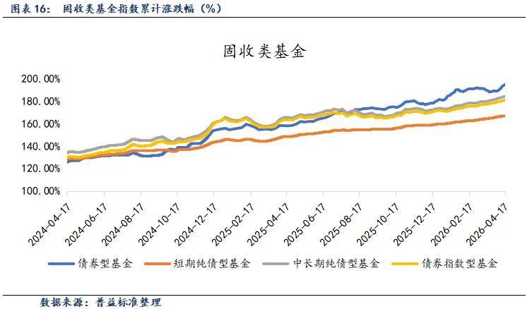 本周各固收类基金指数全部上涨。各类型固收类基金指数表现如下:短期纯债基金指数变动0.04%,中长期纯债型基金指数变动0.07%,债券指数型基金变动0.10%。