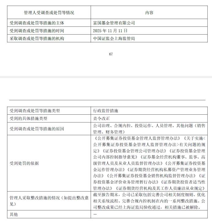富国基金在公告中披露,截至报告期末,公司已采取包括完善公司相关制度细则、优化相关系统流程、完善合规内控机制在内的一系列整改措施。公司整改成果已经上海证监局验收通过,相关措施已被解除。